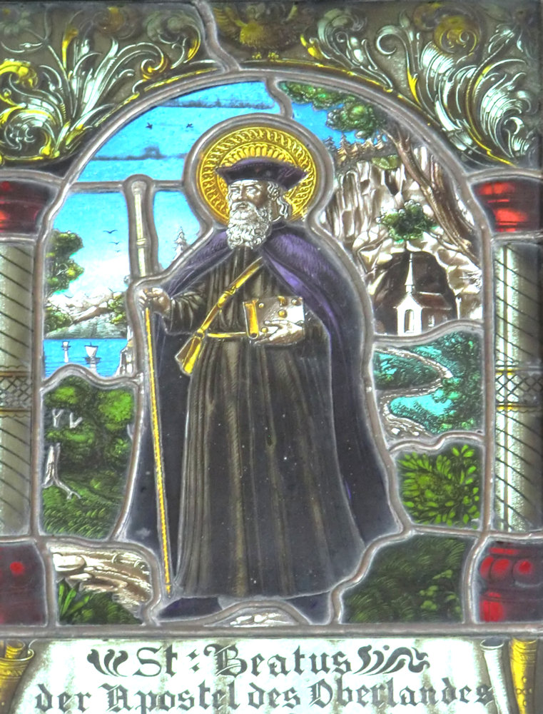 Beatus ist der legendäre erste Missionar der Schweiz. Aus England stammend wurde er angeblich von Petrus zum Priester geweiht und beauftragt, die Schweiz zu bekehren. Die Legende lässt ihn dann zusammen mit seinem Gefährten Achates in den Höhlen bei Beatenberg als Einsiedler leben, wo er einen furchtbaren, feuerspeienden und die Gegend verwüstenden Drachen bekämpft habe, indem er ihm mit einem Kreuz entgegentrat, woraufhin jener sich mit Gebrüll in den See stürzte und ertrank. Beatus wirkte dann als Wohltäter des Landes.