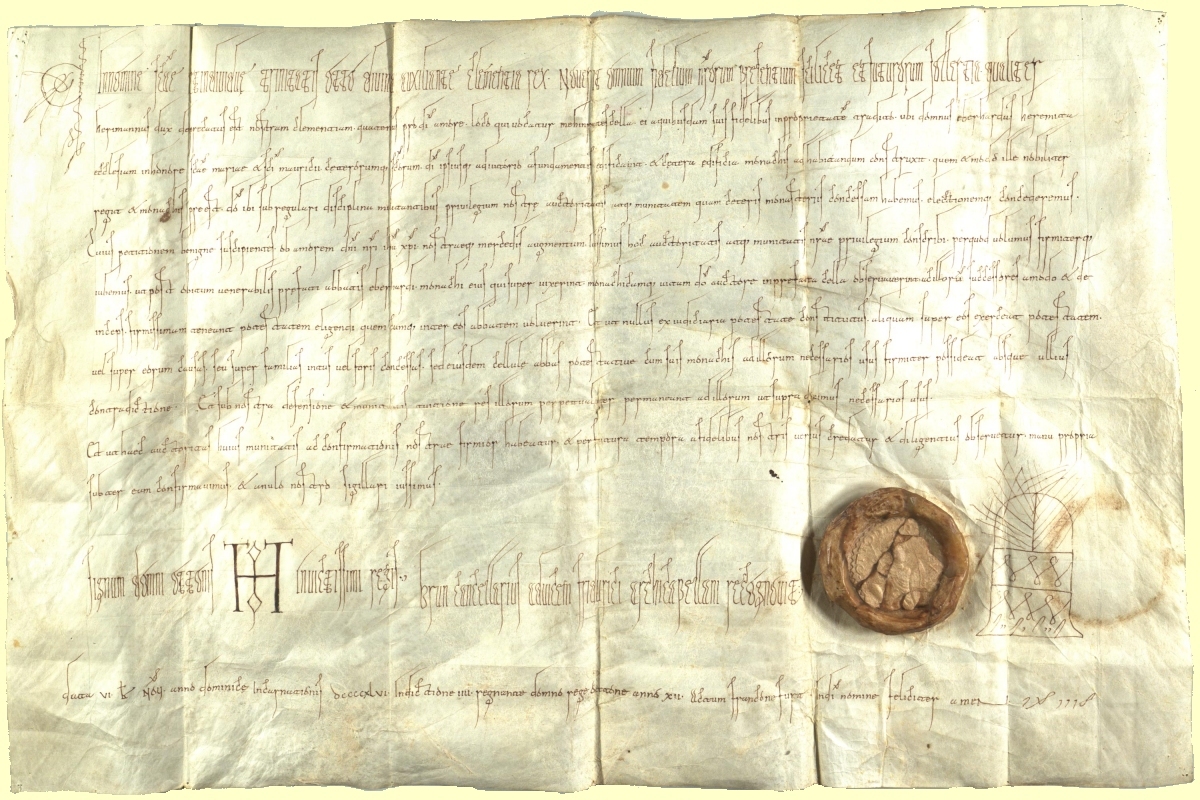 Meinradszell, das Recht freier Wahl des Abtes und Immunität, 947, im Archiv des Klosters Einsiedeln
