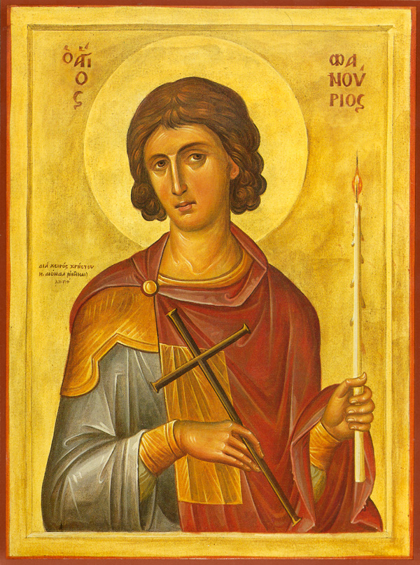 Phanourios war Soldat und wurde zum Märtyrer. Die überlieferten Szenen seines Lebens zeigen ihn, wie er vor der Statue eines Götzen glühende Kohlen in den Händen hält, während ein Dämon danebensteht und sich beklagt über seine Niederlage durch das Bekenntnis des Heiligen. Dann wurde er von einem Beamten befragt, von Soldaten mit Steinen beworfen, auf dem Boden liegend ausgepeitscht und beharkt. Im Gefängnis wurde er mit Kerzen gebrannt, auf ein Foltergestell gebunden, dann unter wilde Tiere geworfen und von einem großen Felsen zerschmettert.