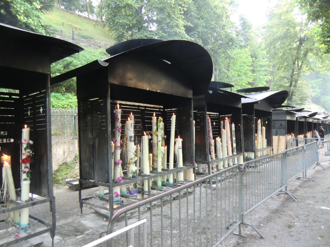 Rechts daneben sind inzwischen Häuschen für die vielen Kerzen der Pilger errichtet, die die Grotte nicht mehr fassen kann, daran